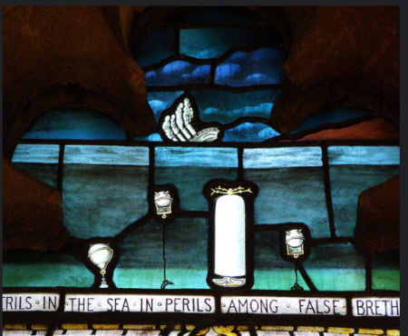 window two top right (Lusitania sinking) "IN PERILS IN THE SEA PERILS AMONG FALSE BRETHREN"