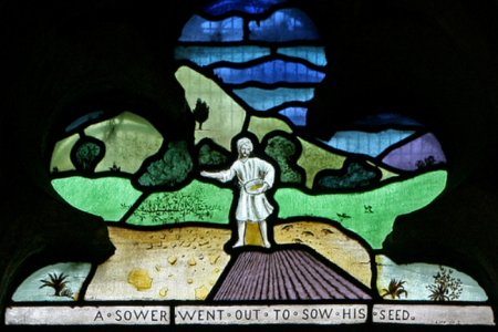 window three, top left(sower) "A SOWER WENT OUT TO SOW HIS SEED"