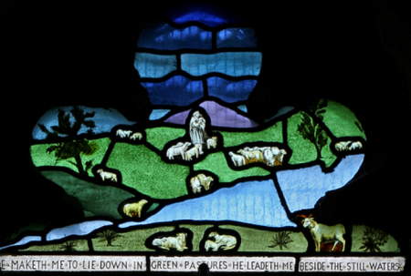 window three, top right(watering sheep) "HE MAKETH ME TO LIE DOWN IN GREEN PASTURES HE LEADETH ME BESIDE THE STILL WATERS"