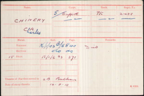 He enlisted in Bury St.Edmunds. His legatees were sister Mrs Lily Everitt, half brother Alfred Chinery and half sisters Mrs Alice May Frost and Mrs Molly Meacham THE HISTORY OF THE 1/5TH BATTALION "The Suffolk Regiment" by Capt. A. FAIR, M.C. and Capt. E. D. WOLTON actually has Charles amongst many killed on the 12th. The problem being that so often the nature of the fighting precluded daily 'writing' up and when the fighting died down, that was often the date used. The 12th was the start of an action that came to be known as 'SNIPER DRIVE', which resulted in many casualties