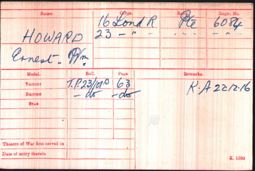 He enlisted in Bury St Edmunds on 16th November 1915, resident in Thurston. His legatee was his mother He gave his correct date of birth on attestation, was 5 ft 5.5 inches (166.4 cm)tall, chest 33"-36" (83.8 to 91.4 cm), weighing 126 lbs (57.2 kg), a Baptist, next of kin his mother. Place on Reserve, he was mobilised on 24th January 1916 into the 16th Battalion, London Regiment and drafted to B.E.F. on 28th June 1916 via Le Havre from where he was sent to join the 23rd Battalion on 29th September 1916. His belongings, returned to his mother, were a testament, hymn book, purse, pocket book, letters, cards and photos. The war diary on 222 December 1916 has :- weather wet to fine - Raid was carried out on the CANAL sub sector by the 140 I.B. Guns of this Coy did not take part in these operations, but stood to until the situation became normal (6:30 pm). Hostile artillery active generally. CWGC has just two of the battalion killed this day