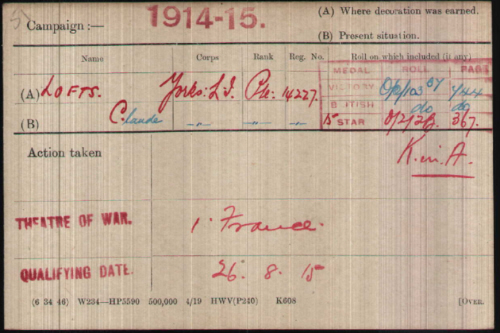 He enlisted in Walham Green, Fulham, apparently adding two years to his age.. His legatee was his mother The battalion was in trenches near Ovillers at the start of the infamous First Day of the Somme.The war diary says:- "1/7/16 - The battalion attacked at 7:30 am, having on its left the 8th Y and L (York and Lancaster), on its right the 2nd Lincolns.In support to our battalion were the 11th S.F. Below is set forth copy of statement made consequently in reporting action to 70th Brigade - "During the preliminary bombardment our losses from hostile shell fire were considerable, estimate them at 10 % of the whole strength. The first two waves leaving our trenches just before 7:30 am reached the German lines with only slight loss. The remaining waves lost heavily in NO MANS LAND from M.G. fire from both flanks. I estimate their losses before they reached the German front line as 60 %. No casualties occurred from our own artillery. The German wire offered no obstacle. Our men were soon mixed up with those of the 8th Y and L, 9th Y and L, 11th SF and 2nd Lincolns , and severe fighting took place for the second German trench, which several times changed hands. Several of our men penetrated at one time the third line. At the second and third lines we were held up by Machine Guns. The enemy relied throughout almost entirely on Machine Guns and Boms, very little on rifles and bayonets. At about 8:30 am the order "Retire" was passed round, possibly originating from the enemy and our men were thereafter organised and rallied by officers of 2nd Lincolns or our NCOs and sometimes by men, returned to the attack, time after time, fighting for the second and third lines. The last man of this battalion to leave the German lines left at about 6 pm and it is thought that there were none of our men being in the German second line. Very few of our officers reached the German trenches. The Germans were many times observed sniping and bombing our wounded. Our Battalion went into action with 25 officers, 1 MO and 659 other ranks. Of these, the M.O. and 110 other ranks have reported to the Battalion. The above statement has been put together from evidence taken from N.C.O.s and men only, no officer taking part in the operation being available. Signed J L Boman, Captain Commanding 8th Bn K.O.Y.L.I. During the night the Battalion was withdrawn to LONG VALLEY. CWGC have 282 of the battalion killed that day, 80 have known graves, the rest are named on the Thiepval memorial.