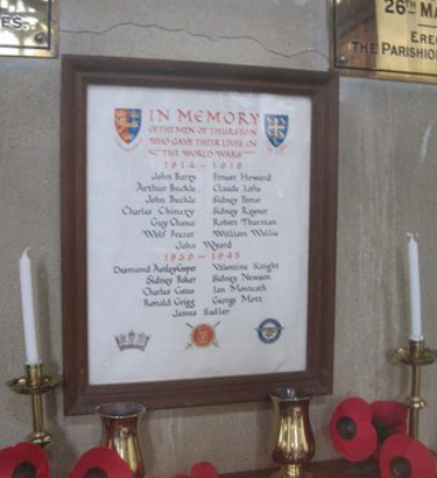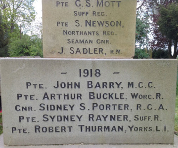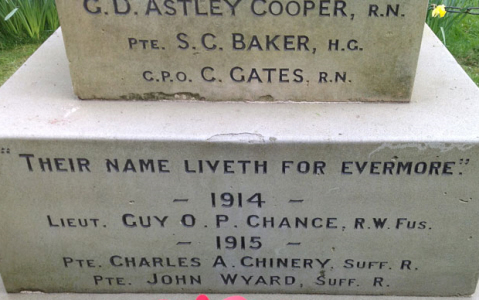 Erected by Messrs Hanchett of Bury St.Edmunds, it was unveiled by Major E.E.Pearson on 20th November 1921, dedicated by Reverend W.B.Bladon, and after World War Two,on 6th June 1948 by Brigadier E.H.W. Backhouse, Colonel, Suffolk Regiment. Reported in the Bury and Norwich Post of 26th November 1920.