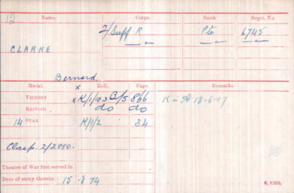 Bernard Clarke was born in Tostock (1st qtr 1885 Stow 4a:747), son of Samuel and Anna Eliza CLARKE (née MURTON). His age is recorded wrongly by CWGC
