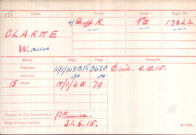 Walter Clarke was born in Tostock (2nd qtr 1889 Stow 4a:758), son of Samuel and Anna Eliza CLARKE (née MURTON).