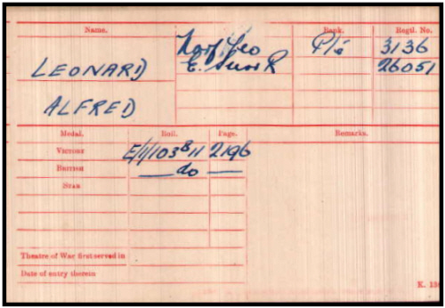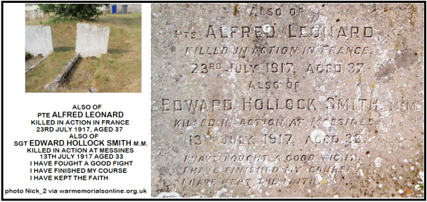 Sometime since a report was received that Private A. Leonard of St Andrew's Street, Mildenhall, had been wounded but from a subsequent report it now appears that he was killed in action on July 23rd. Private Leonard was an employee of W.G.Mothersole of this town before he joined up. Much sympathy is felt for his widow".