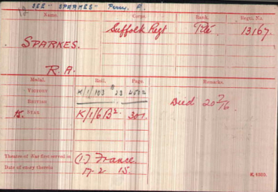 1901 census...Aged 6, he was at Field Farm, Higham Road, Herringswell with his father Richard SPARKES [33] a horsekeeper, born Tuddenham; his mother Jessie [27] born Tuddenham, sister Ellen [5] born Herringswell and sister Caroline [2] born Tuddenham. 1911 census...Aged 16, a farm labourer, he was at Field Farm, Tuddenham with his parents, sister Caroline, and brothers Harry Richard [9] and Willie Edward [7], both born in Tuddenham. Another on the Herringswell Memorial and Tuddenham memorials is his neighbour, Charley Scott, at the same farm.. It seems quite likely that Field Farm was previously known as Charity Farm and lying on the border of Herringswell and Tuddenham, it's location was shared between the two villages depending on who recorded it. |
