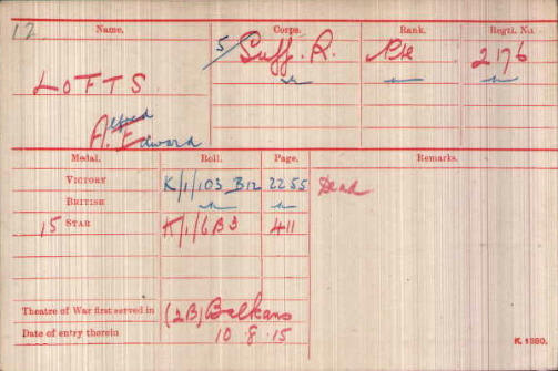 Alfred Edward Lofts was born in Higham (1st qtr 1893 Newmarket 3b:501), son of David and Eliza LOFTS (née PLUMB)