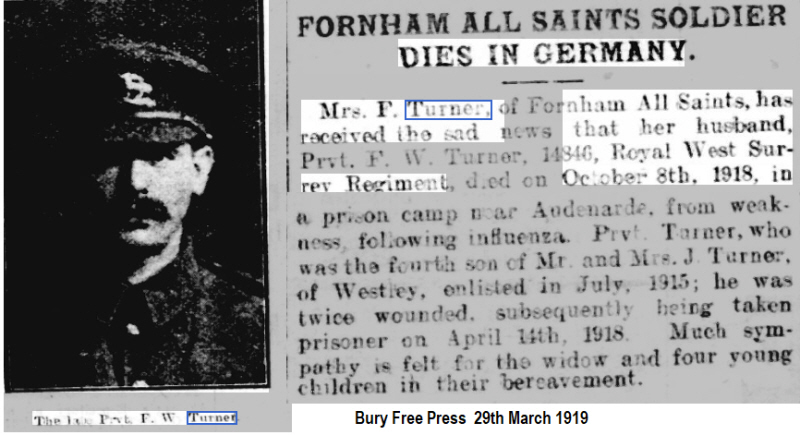 He was captured on 14th April 1918 at Meteren, wounded in left arm. He died at No 1 Prisoner of War camp near Oudenaarde of a heart failure from influenza and buried by the Germans in Oudenaarde. His battalion had 27 killed the day he was captured at Meteren. They had just taken up position south of Meteren to defend the village. They suffered from 12th to 14th April - 2 Officers killed, 10 wounded, 1 missing - O.R.s 36 killed 161 wounded, 160 missing. Here by courtesy of relative is the letter Fred wrote from the prisoner of war camp which his widow received about the time he died. Also the source of his photograph. OPENED BY CENSOR P.W. 1035. Mrs, F. W Turner. Fornham All Saints. Nr. Bury St Edmunds. Suffolk. England. Stamped 15. 9.18....And another stamp Paid Oct.9.18. 3rd August 1918. My Dear Wife and family, I am writing a few lines to you all and hoping this will find you all quite well as it leaves me quite well at present. I want you to let me know how my brothers are and also yours. I want to know how Archey Peachey and George are. Let me know how Frank and George are and also Uncle Dick and Aunt Alice. I want to know how you have been getting on with the alotment (sic) and what sort of crop of potatoes and other vetatables(sic) you have got on it. I don't expect you want to do it. Let me know when you think things will come off. I hope you have been taken care of yourself all you possibly could. I expect that you have a job with the children to keep them right especially the boy Billy. How does the boy Fred and Emily get on at school now. I was captured on the 14 April and I have been treated very well up till the present. What was my sisters (baby?) after all. And how does they all get on. Have you heard anything more about him? I think that all for this time with my best love to you. ................. From Your Loving Husband Fred. (His sister's baby was Phyllis Debenham, not sure who Emily was)