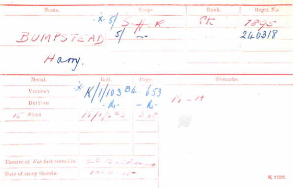 Harry BUMPSTEAD was born in Whepstead (4th Quarter 1890 Thingoe 4a-633), son of William and Elizabeth BUMPSTEAD (née BASS).