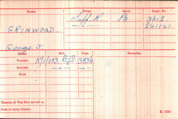 George James GRIMWOOD was born in Whepstead (3rd qtr 1892 Thingoe 4a:737, son of Harry and Alice Mary GRIMWOOD (née SPARROW).
