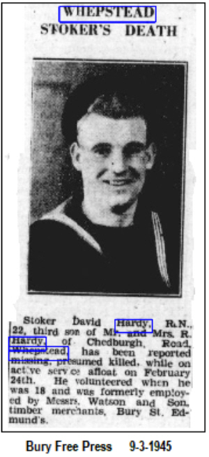 David George HARDY was born in Whepstead on 23rd August 1922 (4th qtr 1922 Bury St Edmunds 4a:1474 , son of Roderick and Mary Elizabeth HARDY (née GRIMWOOD).