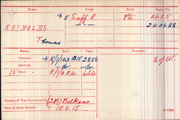 Percy Thomas REYNOLDS was born in Whepstead in 1895 (2nd qtr 1895 Thingoe 4a:787) , son of William Robert and Sarah REYNOLDS (née REEMAN).
