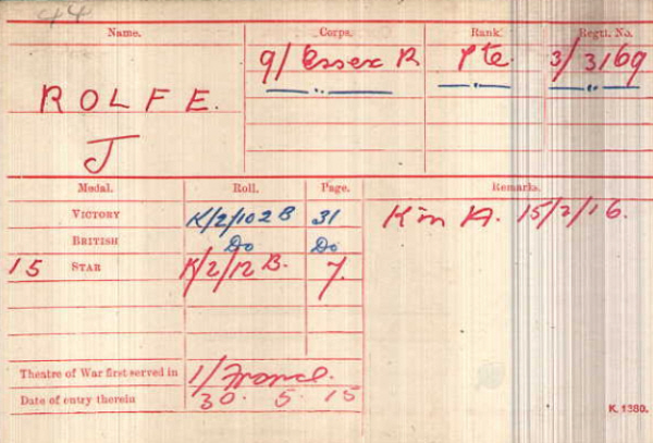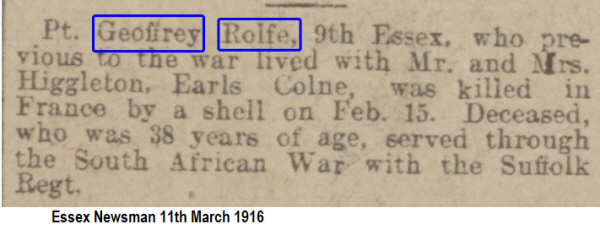 Geoffrey ROLFE was born Whepstead in 1876 (4th qtr 1876 Thingoe 4a:525 , son of James and Elizabeth ROLFE (née BYATT). CWGC have him as J Geoffrey ROLFE but that "J" has not been seen elsewhere except his medal index card, maybe just uncertainty as to whether he was Geoffrey or Jeffery 1881 census... Aged 4, as Jeffery, he was at Old School Road, Whepstead with his father James ROLFE [36] farm labourer; his mother Elizabeth [38]; btothers Thomas [10] and James [8]; sisters Mary A [6], Phyllis [2] and Annie E [8 months]. All were born in Whepstead. 1891 census...Aged 14, as Geoffrey, he was still at Old School Road, Whepstead with his parents; brother Thomas and James (both farm labourers) sisters Phyllis, Annie E., Elizabeth [8] and Janet [6].