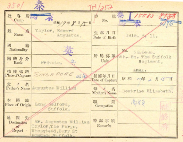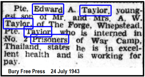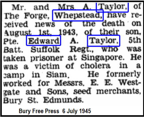 Edward Augustus TAYLOR was born in Bildeston on 11th August 1919 (3rd qtr 1919 Sudbury 4a:1395), son of Augustus William and Beatrice Elizabeth TAYLOR (née WILLIAMS).
