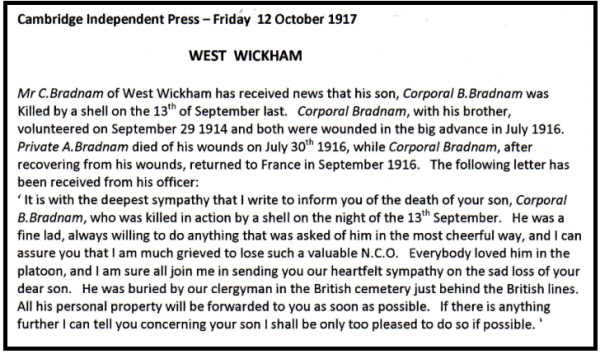 Bennett Bradnam was born in West Wickham (Linton Q3-1890 3B:503), son of Charles and Mary BRADNAM (née REYNOLDS). 1891 census...Aged 1, he was at The Street, West Wickham with his father Charles BRADNAM [39] farm labourer; his mother Mary [38]; sisters Louisa [12] and Rose [4]; brothers John [9] and Fredric [7]. All were born in West Wickham. 1901 census...Aged 11, he was at The Barracks, West Wickham with his father Charles BRADNAM (now horsekeeper); his mother Mary; brothers John [19] and Fred [17] both farm labourers, and Albert [6]; sister Rose [14]. All were born in West Wickham. Also there were his sister Louisa [22] born West Wickham and her husband Henry GRANGER [22] farm labourer born in Dullingham and their son Reginald [7 months] born in West Wickham. 1911 census...Aged 21, a farm labourer, he was in West Wickham with his parents; brother Albert (farm labourer) and nephew Reginald William GRANGER [10] His mother died in 1912, and the pension card has his father at The School, West Wickham His brother Albert, also in the 11th Suffolks, (they had consecutive regimental numbers) died of his wounds in a Manchester hospital in 1916. see here Both brothers had been working on a farm alongside their father and enlisted in Linton on September 29th, 1914. Both were wounded on 1st July 1916. Albert succumbed to his wounds after evacuation to UK, but Bennett recovered and returned to France in September. |