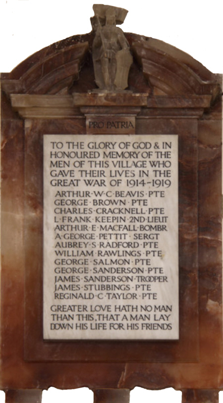 The Cambridge Independent Press of 29th October 1920 reported:- WAR MEMORIAL - A marble tablet inset on alabaster and surmounted by a beautifully carved figure of St George, was fixed on the church wall, over the north door, on Friday, October 22nd, by Messrs Rattee and Kett, of Cambridge, to the memory of the soldiers from this parish who fell in the war. The memorial was unveiled and dedicated on Sunday, October 24th at the morning service.