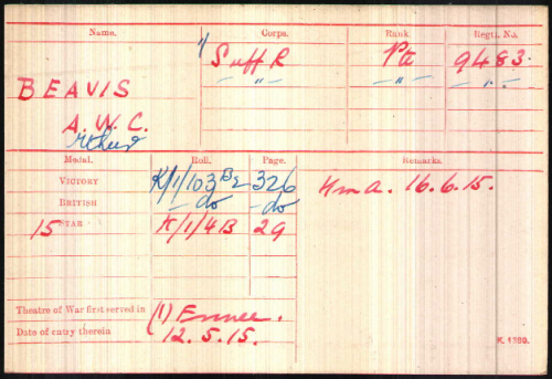1901 census...Aged 5, he was at High Street, West Wratting with his father Arthur BEAVIS [32] a non domestic groom;his mother Adelaide and sister Eva [3]. All were born in West Wratting. 1911 census...Aged 15, a farm labourer, he was at Elm Cottage, West Wratting with his parents (father now a farm labourer); sisters Eva and Violet Rose [7] and brother William Kitchener, twin of Violet, born West Wratting. The family were still in West Wratting on the pension card |