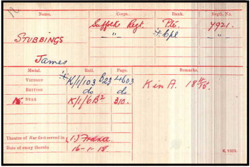 James Stubbings was born in Ickleton on 17th January 1893(Linton Q1-1893 3B:485) baptised in Ickleton on 26th February 1893 son of Ada STUBBINGS. His mother married Henry TAYLOR in Q4-1895.