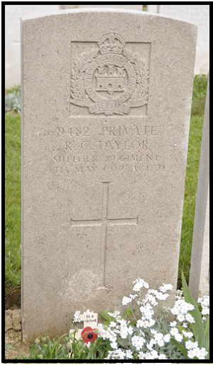 1901 census...Aged 3, he was at High Street, West Wratting with his father Henry TAYLOR [25] horse keeper on farm, born Weston Colville; his mother Ada [27] born Ickleton; brothers Bertie Harry [5], and Frank [1]; sister Hilda Ellen [3 months]. All the Taylor siblings were born in West Wratting. Also there was his half brother James STUBBINGS [8] born Ickleton, and grandfather, widower farm labourer, William STUBBINGS [72] born Elmdon. His father died in 1909. 1911 census...Aged 13, a farm labourer, he was at the Drill Hall, West Wratting with his widowed mother; brothers Bertie Harry (farm labourer), Frank, Arthur [8], Percy [7] and Henry Thomas [1]; sisters Hilda Ellen, Mary [5] and Elsie May [3]. All the children were born in West Wratting. His half brother James STUBBINGS [19] was in the Stanhope Lines, Aldershot in the Suffolk Regiment. As was often the case, he appears to have exaggerated his age on enlistment. His half-brother James Stubbings was killed in 1915 in Belgium serving in the Suffolk Regiment. see here |