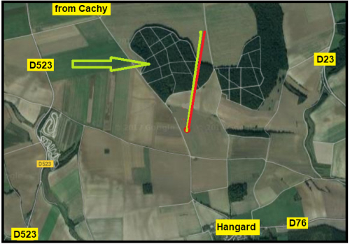 The Battalion war diary has them at Blangy, and under attack from the Germans from early morning on 24th April at Bois de Hangard. The Battalion counter-attack failed due to one company not staying in touch and they were withdrawn late on 25th, but they had captured three machine guns and 65 prisoners. They were relieved in the line by the 8th Queen's that evening. Their objective was the line shown below. The diary gives Blangy, but that must be Blangy-Tronville the map reference for their HQ was certainly in that area. The Germans were getting perilously close to Amiens. CWGC shows 23 of the 2/9th Londons were killed on 25th April 1918, 15 have no identified grave. google earth via www.tmapper.com photo: Roy Beardsworth click here to go to the Commonwealth War Graves Commission website for full cemetery/memorial details |