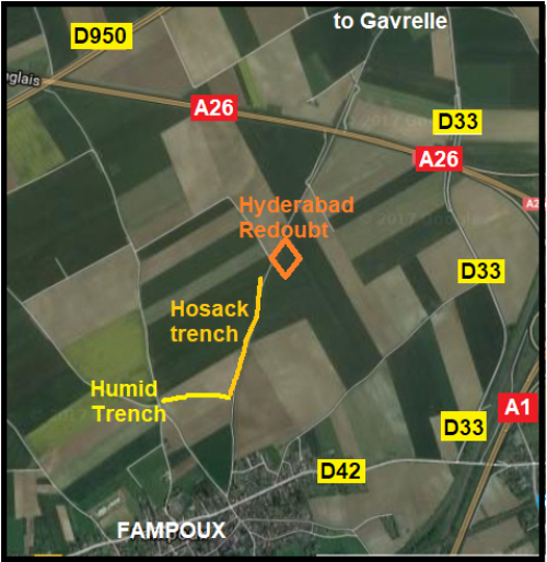 Battalion war diary:- They were in the sunken road from Fampoux to Hyderabad Redoubt. On the 10th they were consolidating. A section of 12th M.G.Coy., got into very good positions supporting us. Orders for the attack to continue. Objective the GREEN LINE as laid down in original operation orders. Moved into Assembly positions in HUMID and HOSACK trenches and sunken road from FAMPOUX to HYDERABAD REDOUBT. The cavalry to pass through us at 4 pm. Snow and very cold. At about 4 pm a company of the SOMERSETS went over to attack the INN at H.7.a.3.8.(ref map 51B NW). Attack failed. Some cavalry appeared about 4:15 pm. Still no orders for the attack to continue. 6 pm orders received to resume normals positions. Patrols sent out reported enemy positions along the ROEUX - GAVRELLE road. Night quiet. Casualties 5 OR killed 9 OR wounded, 2 OR missing.