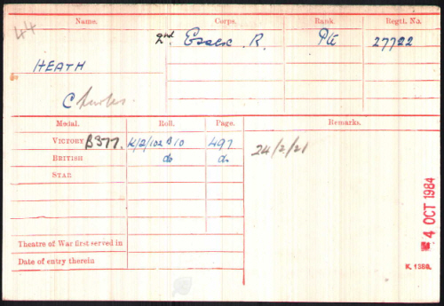 1881 census...Aged 5, he was at Weston Green, Weston Colville with his father John HEATH [32] farm labourer; his mother Eliza [28]; sister Ellen [9]; brothers William [7], Cornelius [4] and James [2]. All were born in Weston Colville. 1891 census...Aged 15, a farm labourer, he was at The Green, Weston Colville with his parents, brothers William, Cornelius and James (all farm labourers) and John [6 months}; sisters Elizabeth [10], Ethel [8], Agnes [6] and Lily [3]. All the new siblings were born in Weston Colville. 1901 census...Aged 26, farm labourer, he was at still at The Green with his parents, brothers William and James (farm labourers), John and Frank [6] born Weston Colville; sister Lily. 1911 census...Aged 34, single, a farm labourer, he was still at Weston Colville with his parents (father now a shepherd); brothers William (farm labourer), James (shepherd), John and Frank (both farm labourers). All 11 siblings survive. |