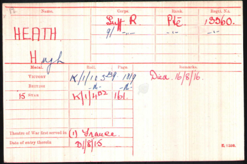 1901 census...Aged 6, he was at Lane House, Weston Colville with his father William HEATH Jnr [35] farm labourer; his mother Mary [30]; sister Lillian [8] and brother Franklyn [9]. All were born in Weston Colville. 1911 census...Aged 16, farm labourer, he was at 10 Willingham Green, Carlton with his parents, brother Franklyn (farm labourer) and sister Ada Elizabeth [8] born Weston Colville. The family were still at Willingham Green on the pension card.