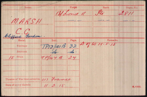 Clifford Gordon Marsh was born Weston Colville (Linton Q3-1896 3B:512), son of Thomas and Lilian MARSH (née BACKLER). His mother was the step-daughter of Charles SPICER a tailor's cutter of Haverhill.