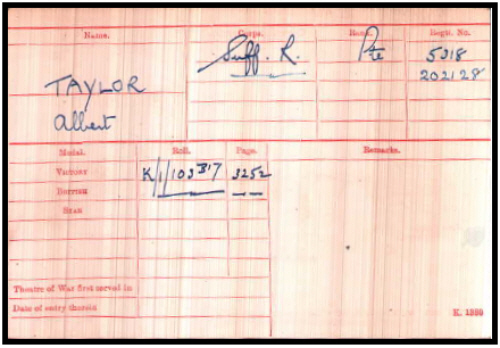 1901 census...Aged 4, he was at The Green, Weston Colville with his father James TAYLOR, [36] horse man on farm; his mother Ellen [33] born Balsham; brothers Reginald [10], Herbert [9], Bertie [8] Trevor W [3] and Montague [11 months] All except his mother were born in Weston Colville. 1911 census...Aged 15, yard boy, he was still at The Green, Weston Colville with his parents; brothers Trevor (errand boy) and Montague; sisters Clara [7], Kate [5] and Alice [4], all the girls born in Weston Colville. All 9 siblings survive. His brother Reginald died in 1914 in France, a regular soldier the Bedfordshire Regiment see here |