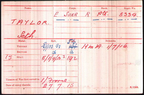 1891 census...Aged 8, he was at Church End, Weston Colville with his father Martin TAYLOR [45] farm labourer; his mother Caroline [40]; brothers Dennis [10], Edgar [6] and Preston [2]; sister Elsie [7 months]. All were born in Weston Colville. 1901 census...Aged 18, a gardener, he was still at Church End, Weston Colville with his parents (father now horse keeper); sisters Ellen [27], Elsie and Nora [8] (Ellen and Nora both born in Weston Colville); brothers Dennis, Edgar and Preston (all three were farm labourers). 1911 census...Aged 28, single, still at Church End with his parents and brothers Denis, Edgar and Preston and sister Nora. All the brothers were farm labourers. |
