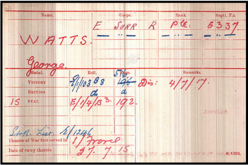 George Watts was born in Weston Colville ( Six Mile Bottom) in 1887 (Linton Q2-1887 3B:526), son of David Brooks and Sarah Ann WATTS (née PATEMAN).
