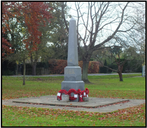 The Wicken memorial, on Pond Green, is a polished, grey granite obelisk, upon a three-tiered plinth, sitting upon a two-tiered flagged pavement.