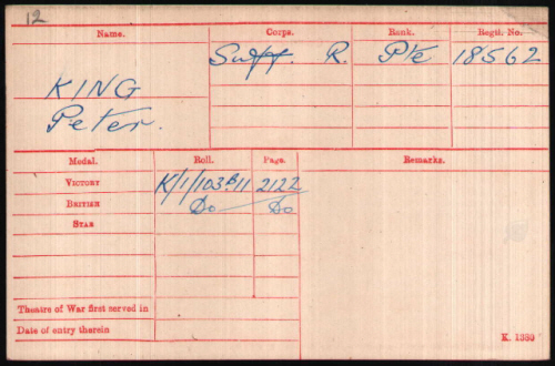 Peter King was born in Wickhambrook (Risbridge Q4-1890 4A:598), baptised in Wickhambrook on 19th April 1891, son of Harry and Jane Julia KING