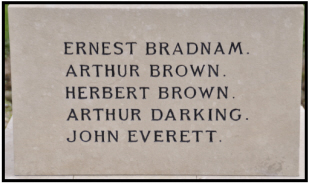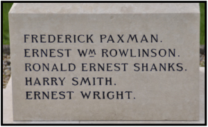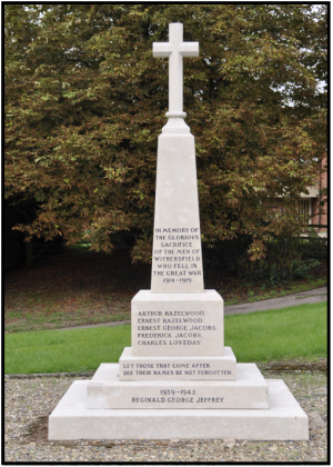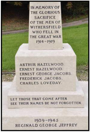 The dedication reads:- IN MEMORY OF THE GLORIOUS SACRIFICE OF THE MEN OF WITHERSFIELD WHO FELL IN THE GREAT WAR 1914-1919 then on the faces of the plinth the names Front face ARTHUR HAZELWOOD ERNEST HAZELWOOD ERNEST GEORGE JACOBS FREDERICK JACOBS CHARLES LOVEDAY On the East face FREDERICK PAXMAN ERNEST WM ROWLINSON RONALD ERNEST SHANKS HARRY SMITH ERNEST WRIGHT on the West face ERNEST BRADNAM ARTHUR BROWN HERBERT BROWN ARTHUR DORKING JOHN EVERETT On the top step, South face:- LET THOSE THAT COME AFTER SEE THEIR NAMES BE NOT FORGOTTEN On the North face 1939-1945 REGINALD JEFFREY