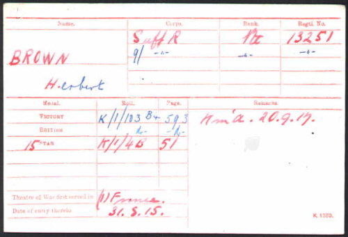 Herbert Brown was born in Withersfield (Risbridge Q2-1894 4A:686) son of Eli and Sarah Hannah BROWN (née CARTER).