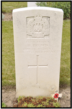 1901 census...Aged 6, he was at Barrack Row, Withersfield with his widower father Eli BROWN,[51] a farm labourer born Withersfield; his brothers David [23], Walter [20] both farm labourers, and Ernest [14] a houseboy; sisters Eliza [18] and Clara [16],these all born in Thurlow; brothers John [10], and Sidney [2]; sister Mary [4], all born in Withersfield. His brother Arthur William [8] was at another Barrack Row address, a boarder with Robert EVERETT, his wife Harriet and their son Alfred. His mother had died earlier in 1901. 1911 census...Aged 17, a farm labourer, he was at Barrack Row, Withersfield with his father Eli BROWN [63] farm labourer; brothers John [21] (farm labourer) and Arthur William [19] a soldier. CWGC have the address later as Hollow Hill Cottages, Withersfield. His brother Arthur William, also in the Suffolks, died in Belgium in 1915 see here |