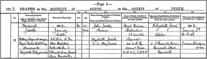 1881 census...Aged 3, he was at Wratting Road, Withersfield with his grandfather William HAZELWOOD [66] farm labourer; his grandmother Sarah HAZELWOOD [63]; his father John JACOBS [25] farm labourer; his mother Elizabeth [22]; sisters Ada M [2] and Edith [3 months]. All were born in Withersfield. 1891 census...Aged 13, a farm labourer, he was at Willow Bank, Withersfield with his parents; sisters Ada, Edith, Emily [8], Sarah [6] and Mehitabel[3]; grandmother Sarah HAZELWOOD. All the new children were born in Withersfield He enlisted in the Suffolk Artillery on 7th January 1897, giving his age as 18 years 2 months, a hair weaver, born and living in Withersfield, next of kin, father John. He was 5 feet 10 inches (177.8 cm)tall, weighed 128 lbs (58.1 kg), chest 32.5" to 34.5" (82.6 to 87.6 cm), hazel eyes, brown hair, Church of England. He transferred to the Royal Artillery on 10th June 1897. 1901 census...Not found in this census, probably due to Army service. At Rose Hill Cottages, Withersfield were his father John JACOBS [45] horsekeeper; his mother Elizabeth [42]; sister Ellen M [13] and brother Victor W [3]. 1911 census...Not found in this census, probably due to Army service. At Rose Hill Cottages, Withersfield were his parents and brother Victor William (farm labourer). His mother had lost 5 of her 13 children. His father died in 1920. In Qtr 4 of 1911, in Dundalk, Ireland, he married Elizabeth Fitzgerald (b.16-8-1882) and at the time of his death they lived at 5 O'Connells Terrace, Barracks Street, Dundalk, Ireland. His brother Ernest died of his wounds in France in 1916 see here |