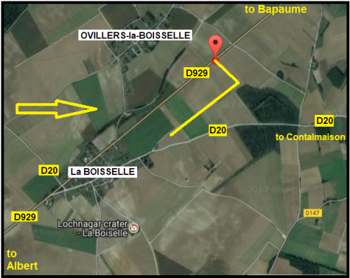 He enlisted in Haverhill. The battalion were at SENLIS, bivouaced at W.23.e on night of 13th. On 15th together with the 13th Cheshire Regiment relieved the 2nd Wiltshire Regiment in the trenches at La BOISSELLE, ref X.9.c.4.6 to X.9.c.8.2. to X.14.b.4.1. However the war diary does not explain exactly where they spent the 14th. CWGC gives 7 killed on the 14th July 1916, none has a known grave yellow line indicates positions referenced above (Google earth via www.tmapper.com) click here to go to the Commonwealth War Graves Commission website for full cemetery/memorial details |