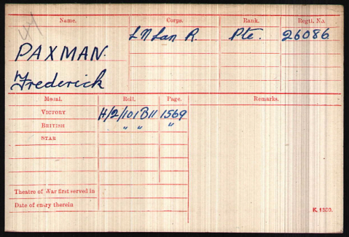 Frederick Paxman was born in Little Thurlow (Risbridge Q3-1890 4A:655), son of Charles and Sarah PAXMAN (née SHANKS).