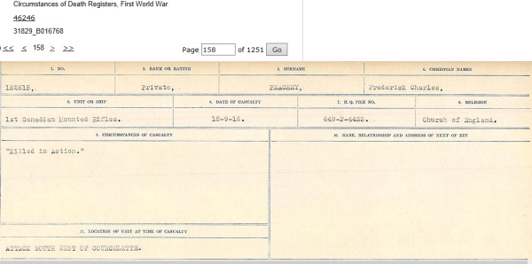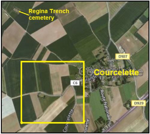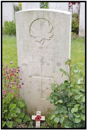 He enlisted in Boissevain, Manitoba, on 30th October 1915 for the 79th Overseas Battalion, giving his next of kin as father Edward Peachey of Rose Cottage, Saxon Street, Cambridgeshire, England. His occupation was farmer . He was 23 years old (dob given as 9th May 1892), 5' 9.5" 176.5 cm)tall, chest 35" to 37" (88.9 to 94 cm cm), weighing 140 lbs (63.5 kg) brown eyes and brown hair, Church of England. Canadian Archives- RG 150, Accession 1992-93/166, Box 7676 - 9..Item Number:572315 He sailed on RMS Lapland on 24th April 1916,landing in UK on 5th May. He joined the 1st Canadian Mounted Rifles in France on 9th June 1916 and according to his 'circumstances of death card', he was killed in action south west of Courcelette. The Battle of Flers-Courcelette, part of the battle of the Somme, started September 15th 1916. The Canadian Corps assaulted on a two-kilometre front near the village of Courcelette. Advancing behind a creeping barrage, by 8:00 a.m. the main objective, a defence bastion known as the Sugar Factory, was taken, and the Canadians pushed ahead to Courcelette. Numerous German counter-attacks were successfully held and by the next day the position was consolidated. In the weeks that followed, the three Canadian divisions again and again attacked a series of German entrenchments. The final Canadian objective was the "ditch of evil memory," Regina Trench. Repeatedly they failed to take it until November. Then the first autumn rains turned the battlefield into a bog and the offensive staggered to a halt. The line had been moved forward only ten kilometres. The Somme had cost Canada 24,029 casualties. Frederick was initially buried by a graves registration unit but not not moved until a sweep of the area shown below in 1919, when he and a few others (unidentified) were moved to Regina Trench Cemetery. |