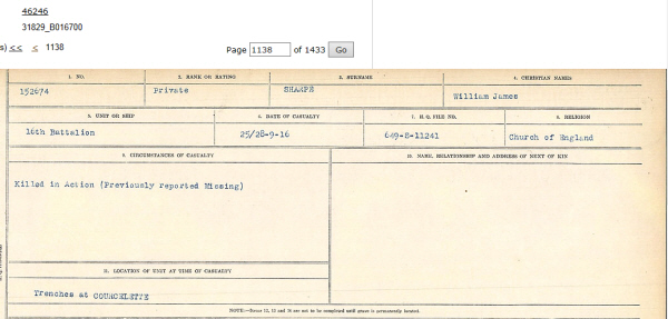 On 5th August 1915 he attested for the 79th Overseas Battalion of the Canadian Infantry at Brandon, Manitoba. He was 5' 6" (167.6 cm) tall, chest 33.5" to 37"(85.1 to 94 cm) Canadian Archives :-RG 150, Accession 1992-93/166, Box 8809 - 32 Item Number: 223589. His mother's address at 67 Saxon Street has been deleted and replaced with 51 Stamford Terrace, Exning Road, Newmarket. His medals were sent to this address. His will left everything to his sister Winnie. He embarked on R.M.S. Lapland on 24/4/1916. arriving in England on 4th May 1916, transferred from 79th Bn to 16th in France on 26/6/1916. He was killed in the Battle of the Somme. His "circumstances of death" card held by the Canadian Archives records he was killed in action in trenches near Courcelette being previously posted as missing on 25th September 1916, body not recovered for burial. The Battle of Flers-Courcelette, part of the battle of the Somme, started September 15th 1916. The Canadian Corps assaulted on a two-kilometre front near the village of Courcelette. Advancing behind a creeping barrage, by 8:00 a.m. the main objective, a defence bastion known as the Sugar Factory, was taken, and the Canadians pushed ahead to Courcelette. Numerous German counter-attacks were successfully held and by the next day the position was consolidated. In the weeks that followed, the three Canadian divisions again and again attacked a series of German entrenchments. The final Canadian objective was the "ditch of evil memory," Regina Trench. Repeatedly they failed to take it until November. Then the first autumn rains turned the battlefield into a bog and the offensive staggered to a halt. The line had been moved forward only ten kilometres. The Somme had cost Canada 24,029 casualties. |