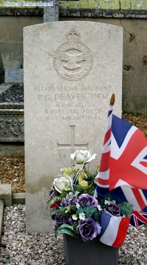 Peter was navigator in a Moquito FBVI, ser no NI408 (based at Lasham, in Hampshire)) flown by Flying Officer Robert Cohen which took off at 13:00 from Swanton Morley on April 11th 1944 to bomb the Population Registry in the KleyKamp in The Haque, Netherlands. This building held the original Dutch registration documents and jeopardised any attempt to forge passes etc. The raid was partially successful, but many document were safe in fire proof cabinets, and many innocent civilians working in the building were killed (it had been believed initially that those working there were collaborators but in the event few were. All six aircraft returned safely. Peters plane was piloted by 21 year old Robert Cohen, a student of Delft University. Cohen was of Jewish descent and succeeded together with a co-student to cross the North Sea between 19 and 22 June 1941 in a canoe and to reach England. There he volunteered with the Royal Air Force. The two were still together when, on the evening of 10th August 1944, they took off from Lasham in Mosquito NT106 part of a flight of 14 Mosquitos of 613 Squadron ( RAF) on an Intruder mission ( opportunity attacks on German targets on the ground) on the sector Chartres- Dreux-L'Aigle - Domfront. According to John Vick flying in Mosquito Nr 194 PZ 613 Squadron, he took his plane to target a German train parked near the station at Tillières -sur- Avre. He got a call from Cohen to ask if there was any activity in the area. Receiving an affirmative, Cohen then diverted towards Tillières -sur- Avre to attack the same German train track as John Vick. However, between the two attacks , the German soldiers had time to reorganize and Flak located on the heights of Tillières -sur - Avre was operational again . When Cohen's Mosquito came over the city , he was immediately targeted by flak . Mortally wounded, the aircraft lost altitude and crashed near Breux -sur- Avre and two airmen perished. Peter Deave is buried there, but Robert Cohen was later re-buried north of Paris at the NETHERLANDS FIELD OF HONOUR at Orry la Ville. The citation for Peter's DFM was gazetted in September 1944. His participation in the raid on KleyKamp was no doubt taken into consideration:- 658425 Flight Sergeant Peter George DEAVES, R.A.F., 613 Sqn As observer this airman has taken part in a large number of sorties, involving attacks on air- fields, railway installations, mechanical transport and other military targets both by day and night. He has displayed great skill and co-operation and his excellent work has contributed in good measure to the successes obtained. He has set a fine example to all.