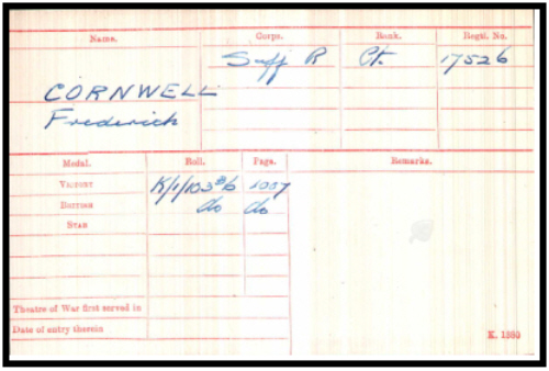 Frederick Cornwell was born in Barnardiston (Risbridge Q2-1891 4A:724), baptised in St Peter & St Paul, Kedington in June 1891, son of John and Rose Ellen CORNWELL