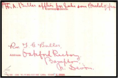 1901 census...Aged 9, he was at The Rectory, Danes Road, Sth Manchester with his father Frederick G. BULLER [45], priest, born Dorchester; his mother Margaret M. [45] born London and sister Winifred M [3] born East Stoke, Dorset. 1911 census...Aged 20, an undergraduate at Trinity College Oxford, he was living at Thundridge Vicarage, Ware with hi suncle and aunt, John and Caroline Pelham. His parents were at Oakford Rectory, Bampton, Devon with his sister Winifred. His mother had born 5 children but one had died |