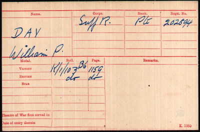 1881 census...Aged 10 months, he was at 5 Artillery Terrace, Grantham with his father John DAY [25] bricklayer, born Clavering, Essex; his mother Elizabeth [30] born Toft, Lincolnshire and sisters Clara [4] and Elizabeth E [2] both born in Grantham. 1891 census...Aged 10, as Barker DAY, he was at the Farmhouse, Gaston Green, Little Hallingbury, Essex with his parents (father now a carpenter ); sisters Clara, Elizabeth and Ethel [5] born Little Hallingbury; brothers Philip [7] and George [3] both born in Little Hallingbury. 1901 census...Aged 20, as Parker DAY, he was a worker at Great Sampford, Essex with his parents (father now a miller); sister Ethel and brothers Philip and George In 1909 he married Lily Beatrice JOHNSON in Ashdon. 1911 census...William Parker DAY, aged 27 (?) a corn miller, he was boarding at the Rose Inn, Burwell with Jabey and Agnes CHAPMAN. His wife Beatrice Lily [27] born Hempstead, Essex was with their daughter Emily [1] born Romford, visiting Henry and Lizzie GRAY at Pitley Farm, Great Bardfield, Essex. Their address later was Casburn's Lane, Newnham, Burwell. The entry on CWGC indicates he was born in Ashdon, but this was actually Beatrice's birth place.. |