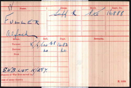 1891 census...Aged 6, he was at New Town, Ramsey, Hunts with his father George FULLER [28] stationary engine driver, born in Burwell; his mother Mary Ann [26] born Somersham, Hunts; brother Charles William [3] born Ramsey and sister Eliza [2 months] born Ramsey. Brother Andrew was born in 1893 in Ramsey 1901 census...Aged 16, a baker's apprentice, he was at North Street, Burwell with his parents (father now labourer in manure factory), brother Charles, sister Eliza and a brother Andrew [7] born Ramsey. It is believed that his mother died later this year. 1911 census...As William, with brother Andrew, both labourers boarding with the SHIPP family at Mandeville, Burwell. The rest of the family not yet found. Father and Alfred/William at some time were in Isleham Main problem is that he was registered at birth as Alfred and by 1911 he was William and died and was buried as William Alfred (age recorded as 30) on the burial register. The Army seems to have him always as Alfred but have several conflicting aspects of his service documents by Service records and Pension Records It is reasonable to have William Alfred and Andrew as brothers. see here |