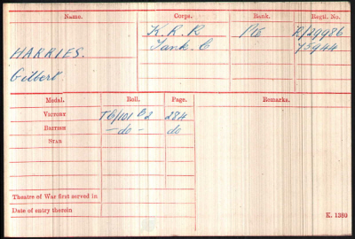 1891 census...Aged 3 months, he was at School House, High Town, Burwell with his father Isaac HARRIES [32] schoolmaster elementary, born Monkton, Pembroke; his mother Emma J A [30] born Clerkenwell and brother Stanley [2] born Holborn. There was another brother Charles Edward who died aged 10 days in November 1893 1901 census...Aged 10, he was still at the School House, Burwell with his parents and brother Stanley. 1911 census...Aged 20, a student, he was still at the School House, Burwell with his parents. The pension card has the family still there. He was the younger brother of Rifleman Stanley HARRIES who died in 1916 and is buried in Burwell see here |