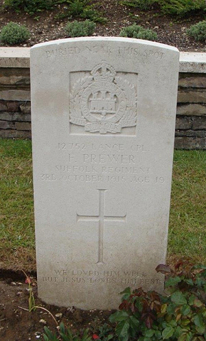 sailed to Egypt. The death toll in this sorry affair was 32 on the 3rd, which under the circumstances was very fortunate. Three newspaper cuttings at the time :- The Cambridge Independent Press of 15th October 1915:- Death of a Burwell Lad Mr,. and Mrs. Prewer of 1 Ness Road, Burwell have received information from Serg. Griffiths, of the Welsh Regiment, of the death of their second son,Lance Corpl. Fred Prwer, of the 1st Suffolks, in the trenches in France on Sunday, October 3ed. Mr Prewer is road foreman to the Newmarket Rural Council. Young Prewer was 18 years of age on August 13th. he worked as Messrs Laing's grocery shop before the war. When he enlisted he was only 17 years of age, but he allowed his age to be recorded as 19. He was wounded in the arm some four months ago, when he wrote home to the Rev. J.W.Upton, sating that he hoped top come home on a short furlough, but he could not get leave, although for some weeks he was not sent to the firing line. Sergt.Griffiths, who appears to be attached to the Suffolks, writes to his parents to say that he was struck on the back of his head by a piece of shrapnel and died about ten minutes later. He was talking to the sergeant just before the shrapnel hit him. The sergeant sent home the photographs of his sister and his sweetheart and of a Burwell friend that were found in his pockets. On Tuesday morning the Vicar caused the bell to be tolled. On Sunday evening a memorial service will be held at the Burwell Congregational Church. The Late Lance-Corp., PREWER -On Sunday evening last a memorial service was held in the Congregational Church, when the Rev.J.W.,Upton paid a last tribute of esteem to the memory of Lance-Corpl., Fred Prewer of A Co., 1st Suffolk Regt.,who was killed in action in France on October 3rd. The hymns known by the deceased were sung during the service, and the text of the discourse was from St.John's Gospel, xv..13, Greater love hath no man than this, that a man lay down his life for his friends." Mr.and Mrs. Prewer and family desire to publicly thank the many friends who have sympathised with them in their great sorrow. -The sister of Corporal Prewer has received the following letter from Sergt.W.Griffiths, of the 6th Welsh Regt., who was attached to the 1st Suffolk Regt., with which Corporal Prewer was serving: "Dear Miss Prewer - It is with the deepest regret that I have to inform you of the death of your brother, No.12752, Corporal F.Prewer, A Company, 1st Suffolk Regt., which occurred about 2:30 pm on the 3rd inst. He had just spoken to me when a fragment of shell struck him in the back. He lived about ten minutes when he passed away. I can assure you he suffered no pain and every means was taken to save him, but with no result. it was my very unpleasant duty to take charge of all the articles found on him, which I handed over to the platoon sergeant of his Company. I retained the photos which I enclose. You and your family have the great consolation of knowing that he died in defence of his country, doing his duty as a son of our glorious Empire. I sincerely pray that God will console you all in the great loss you have sustained and that HE will assist you to bear it with great fortitude - Again, expressing my deepest sympathy, I am, your truly, W. Griffiths". and also "BURWELL LAD THAT COULD BE TRUSTED": Capt. E.D.C. Hunt, of the 1st Suffolks, writes from St Male, Felixstowe (sic), to the parents of Lance-Corpl.Fred Prewer of Burwell, of the 1st Suffolk, killed in action in France, October 3rd, as follows:- "Dear MNr. and Mrs. Prewer, -I have long been intending to write to you and to send you my deep sympathy in the loss of you dear son, No.12752 Lance-Corpl.,Prewer. It took me some weeks to find out what had happened to your son, and when I heard it took me some time to find out the details. I therefore apologise for the delay, and hope you will excuse it. I think your son must have fallen the same night I was hit, October 2-3. He was in my Company, "A", throughout the summer, and always showed great promise and bravery. I have always put great trust in him, and if I was going out on any patrol work or for any dangerous purpose, I always took your son with me, because I felt I could trust him as well as any man in my Company, because he always kept cool and was always bold and keen. I cannot speak too highly of him. I think there was real affection between us, and we did all we could for one another. Everything was so upset during the night of October 2-3 that I have no recollection of where your son was when he was hit. The Germans allowed us to get within about 40 yards of their trenches, when they let out the most terrific fire, and it was a surprise to me that we did not have more casualties. I myself was hit in the right hand, but managed to get back without further injury. Please accept my very deep sympathy in the loss of your gallant son, and at the same time excuse my long delay in writing to you |
