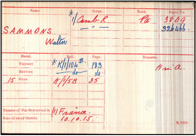Walter Percy Sammons was born in Burwell on 1st January 1891 (Newmarket Q1-1891 3B:542), baptised in Burwell on 4th November 1892, son of